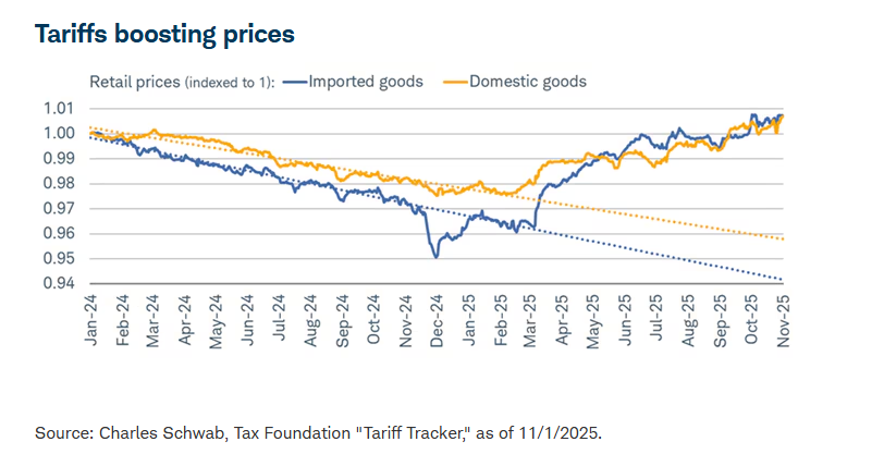 Data and analysis from the Tax Foundation shows the impact of tariffs on retail prices for both imported and domestic goods compared to their pre-tariff trend. While the impact to imported goods has been stronger, domestic goods prices have risen in lock-step. And an important reminder from Liz Ann Sonders at Charles Schwab, “tariffs are taxes on U.S. importers; they are not (repeat, not) paid by exporters in other countries.”